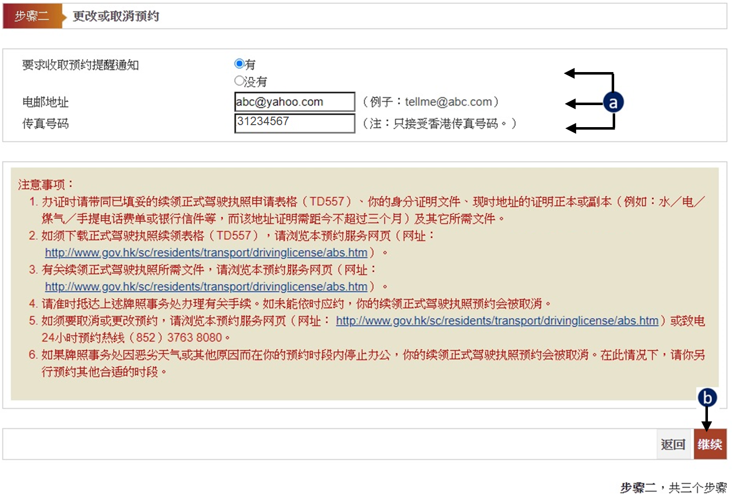 如果要求收取预约提醒通知选择「有」。输入电邮地址和传真号码.