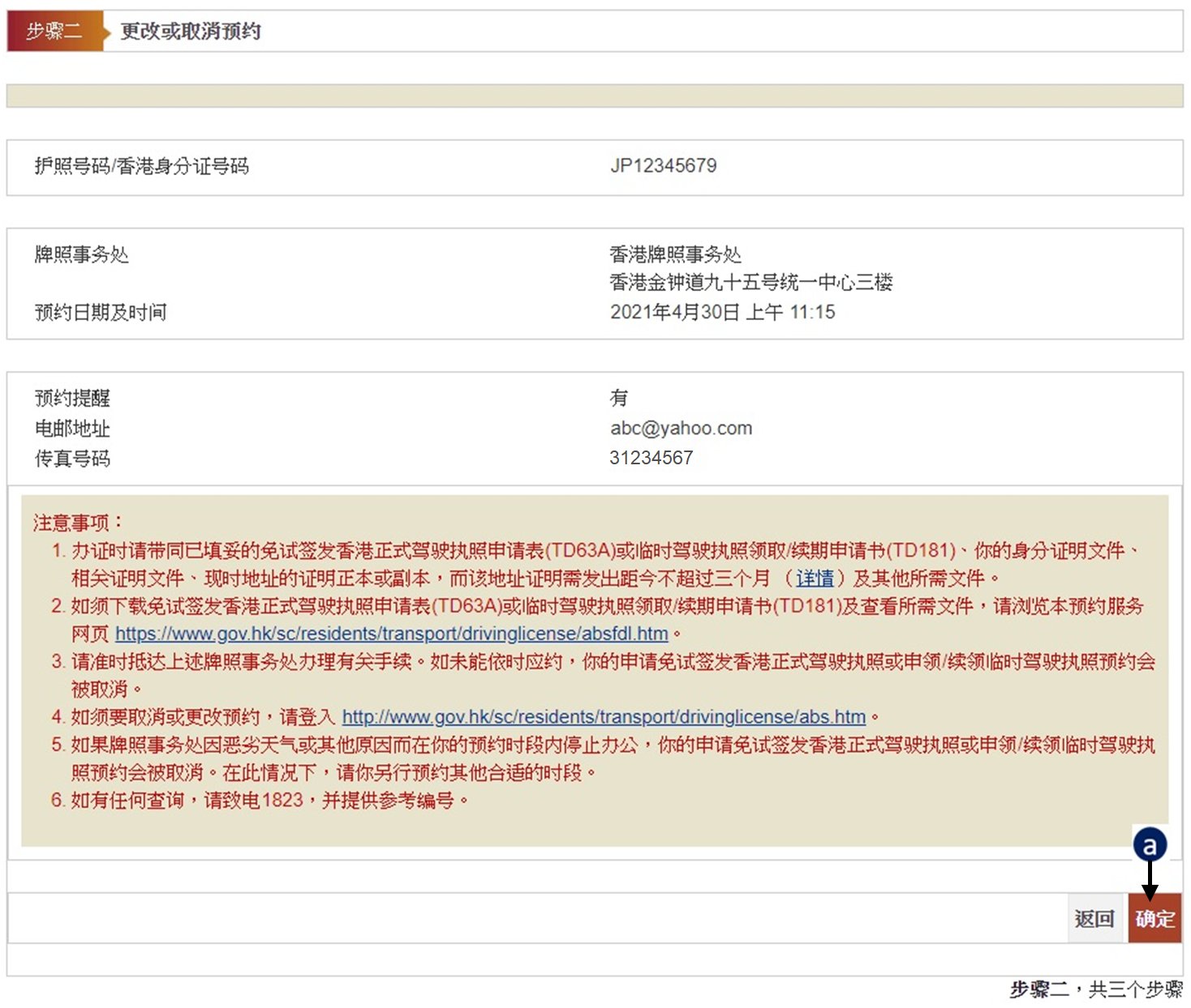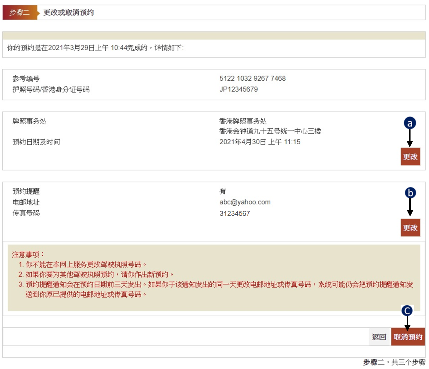 如需更改牌照事务处或预约日期及时间资料,按「更改」,然后请看下文显示。