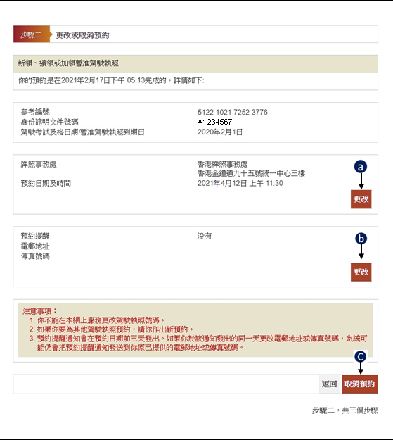 如需更改牌照事務處或預約日期及時間資料,按「更改」.