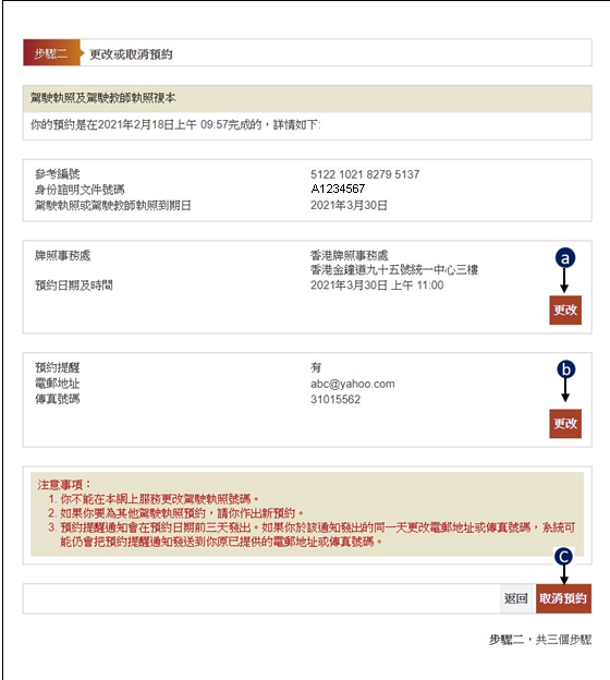 如需更改牌照事務處或預約日期及時間資料,按「更改」.