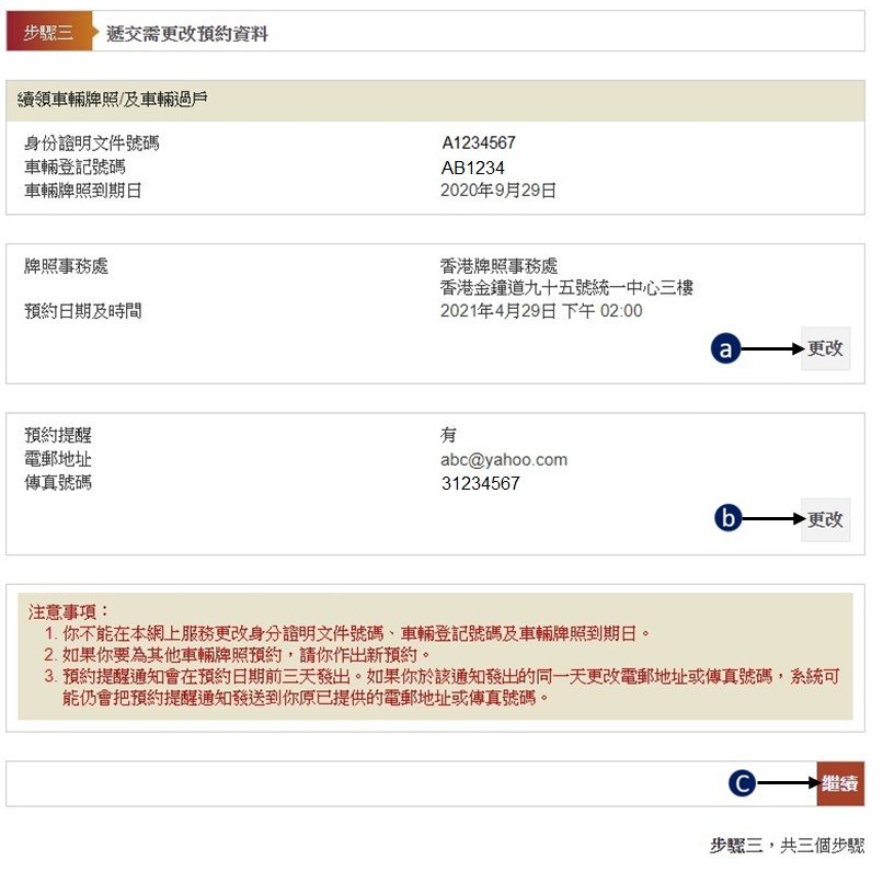 如需更改牌照事務處或預約日期及時間資料,按「更改」