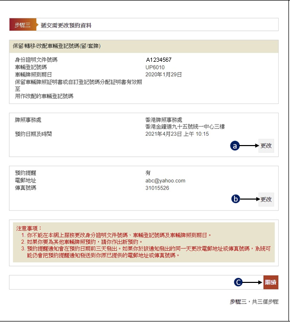 如需更改牌照事務處或預約日期及時間資料,按「更改」
