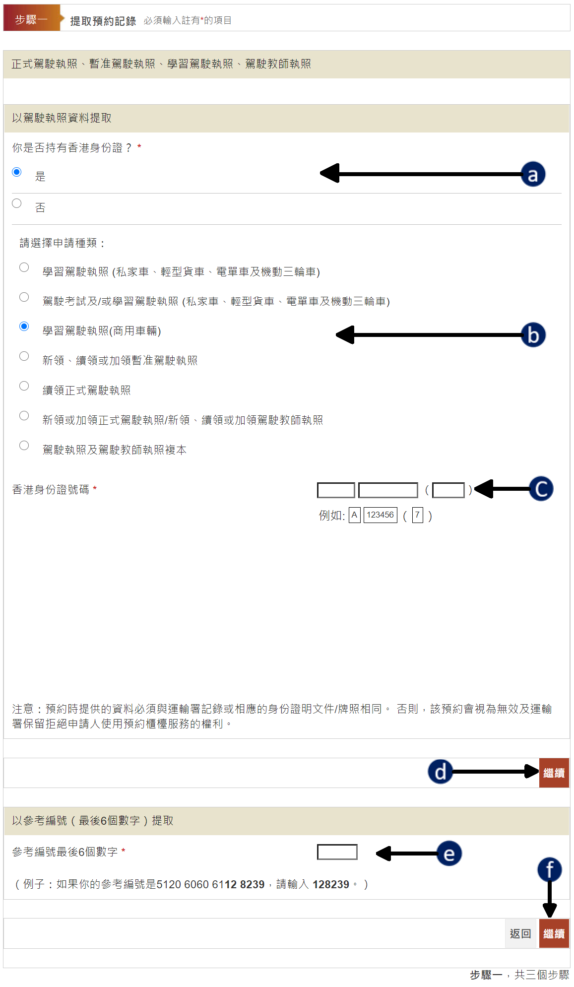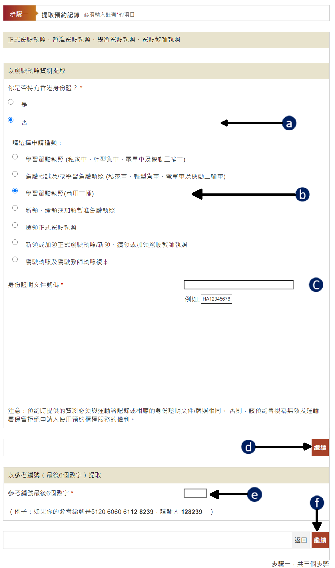 如果你有預約參考編號, 你可以步驟 “e” 和 “f” 提取